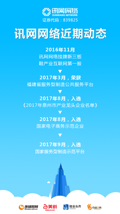 訊網(wǎng)網(wǎng)絡(luò),新三板上市企業(yè),國內(nèi)領(lǐng)先的鞋行業(yè)全鏈條B2B電子商務(wù)平臺運營商,2002年成立。十五年來,始終圍繞鞋業(yè)媒體資訊、鞋產(chǎn)業(yè)B2B平臺交易、SAAS應(yīng)用三大領(lǐng)域創(chuàng)造性的改變了傳統(tǒng)市場,積累了平臺、用戶、內(nèi)容、技術(shù)、應(yīng)用等深厚的發(fā)展資源,成功打造了“環(huán)球鞋網(wǎng)”、“美料APP”、“鞋業(yè)頭條”、“中國網(wǎng)訊”、“云商鋪”等品牌平臺。是商務(wù)部電子商務(wù)示范企業(yè)、國家高新技術(shù)企業(yè)、國家服務(wù)型制造示范平臺等榮譽稱號。