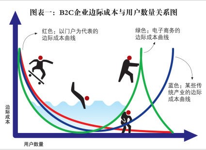 與門(mén)戶(hù)等互聯(lián)網(wǎng)產(chǎn)業(yè)一樣,B2C產(chǎn)業(yè)特征是典型的邊際成本先下降再上升,然后再下降的反微笑曲線(xiàn)(如下頁(yè)圖表所示)。無(wú)論是水漲船高的網(wǎng)絡(luò)推廣費(fèi)用,抑或是讓各家B2C企業(yè)坐如針氈、日益高昂的客戶(hù)獲取成本,B2C企業(yè)之爭(zhēng)已經(jīng)從原有的“野蠻式生長(zhǎng)”的陣地戰(zhàn),過(guò)渡到了今日的“搶人戰(zhàn)”。