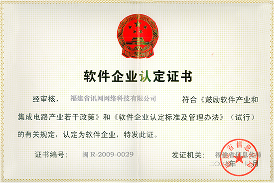 2009年10月,經國家信息產業部授權,由福建省軟件行業協會認定的2009年福建省第三批軟件企業名單最終出爐。福建省訊網網絡科技有限公司力壓眾多競爭對手順利入選,成為為數不多的福建軟件企業“明星隊”的一員。